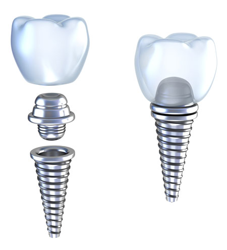 Implantate bestehen aus Titan, einem der stabilsten Werkstoffe überhaupt. Es treten nahezu nie Defekte am Implantat oder Allergien auf. Die Krone, also der sichtbare Teil wird mit dem prothetischen Aufbau am Implantatgewinde verankert.